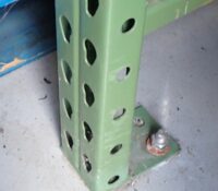 A standard pallet storage rack column. Notice the unused anchor hole on the bottom plate. Oftentimes only one anchor hole must be bolted down. Left completely unattached to the floor, however, storage racks are not installed according to ANSI MH16.1. They can lift, slip or tip over, creating possible damage to inventory or harm to bystanders.